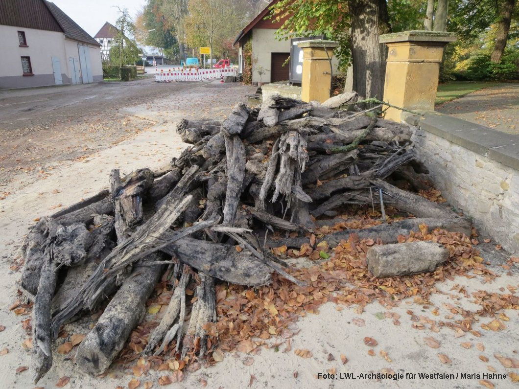 Ein Stapel alter Holzbalken türmt sich im November 2020 an der Wallenbrücker Marienkirche. Bei Straßen- und Kanalbauarbeiten an der Neuenkirchener Straße in meinem Heimatort Spenge-Wallenbrück im Kreis Herford stößt man auf Jahrhunderte alte Holzbalken.
